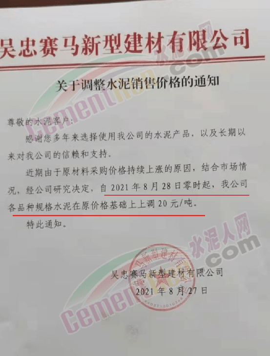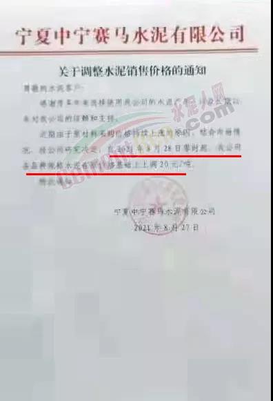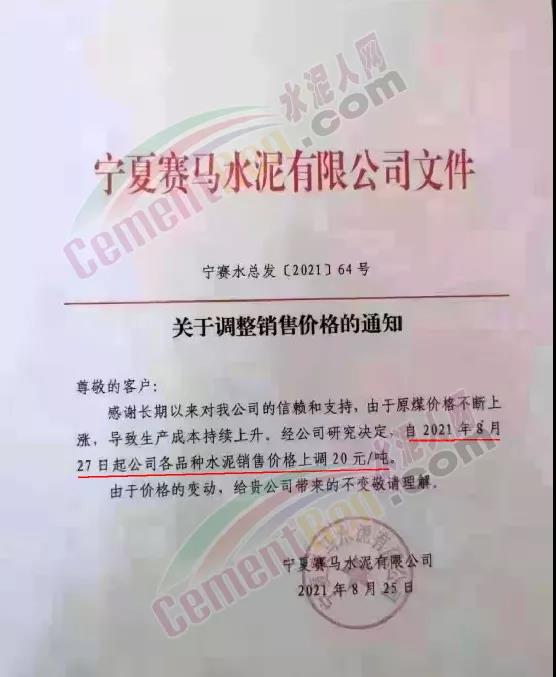 另據(jù)消息稱,寧夏區(qū)域多家品牌企業(yè)也于近日上調(diào)了水泥價格。寧夏吳忠賽馬新型建材有限公司通知 ,由于原材料采購價格持續(xù)上漲的原因,結(jié)合市場情況經(jīng)公司研究決定 ,自2021年8月28日零時起,公司各品種規(guī)格水泥在原價基礎(chǔ)上上調(diào)20元/噸。