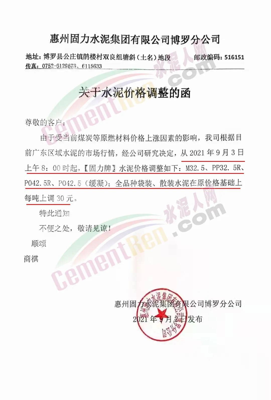 惠州固力水泥集團有限公司分公司通知,受當(dāng)前煤炭等原燃材料價格上漲因素的影響,公司根據(jù)目前廣東區(qū)域水泥的市場行情決定,從2021年9月3日上午8時起,“固力牌”M32.5、PP32.5R、PO42.5R、PO42.5(緩凝);全品種袋裝、散裝水泥在原價格基礎(chǔ)上上調(diào)30元/噸。