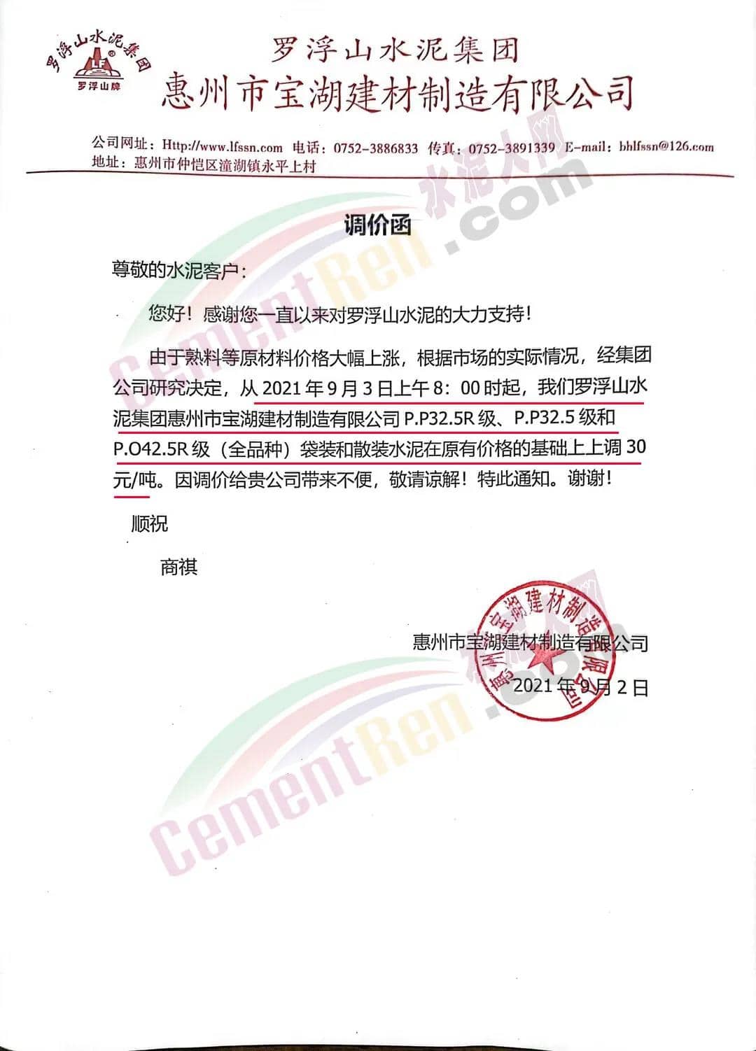 惠州市光大水泥企業(yè)有限公司通知,從2021年9月3日0時起,公司銷往惠州區(qū)域(含河源片區(qū))的散裝水泥和包裝水泥在原有價格的基礎(chǔ)上上調(diào)30元/噸。