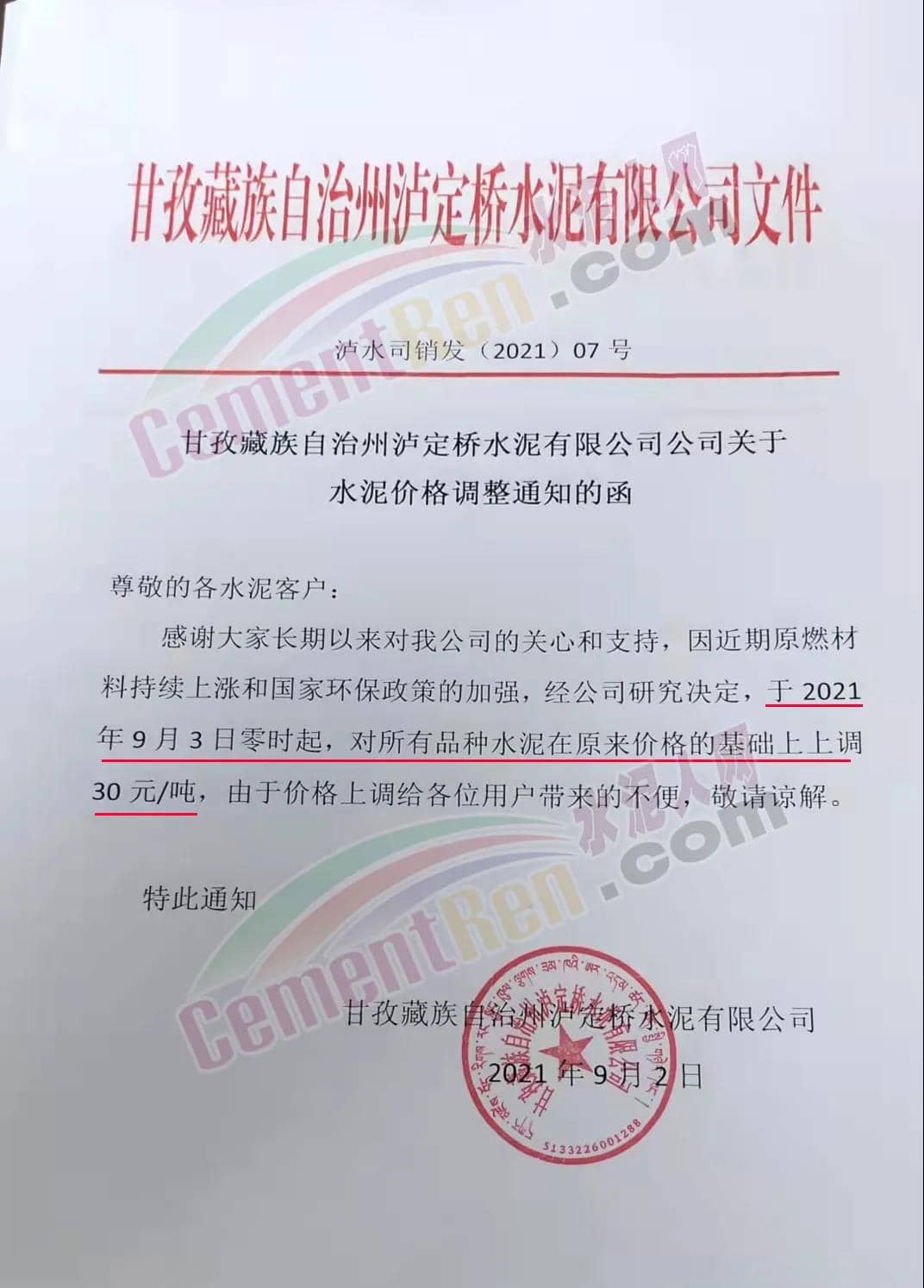 四川瀘定山盛水泥有限公司通知,因近期原燃材料持續(xù)上漲和國家環(huán)保政策的加強,經(jīng)公司研究決定,于2021年9月3日零時起,對所有品種水泥在原來價格的基礎(chǔ)上上調(diào)30元/噸。
