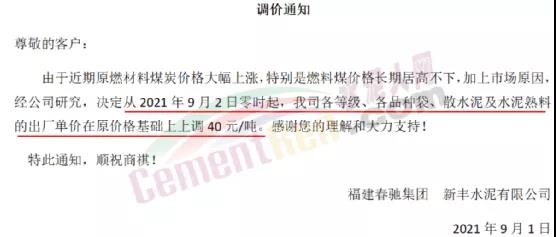 福建春馳集團新豐水泥有限公司通知由于近期原燃材料煤炭價格大幅上漲,特別是燃料煤價格長期居高不下,加上市場原因,經(jīng)公司研究,決定從2021年9月2日零時起,公司各等級、各品種袋、散水泥及水泥熟料的出廠單價在原價格基礎(chǔ)上上調(diào)40元/噸。