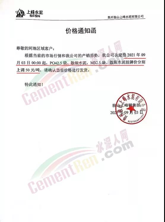 貴州獨山上峰水泥有限公司通知,根據(jù)當(dāng)前的市場行情和公司的產(chǎn)銷形勢,公司決定自2021年9月3日0時起,PO42.5袋、散裝水泥,M32.5袋、散裝水泥掛牌價分別上調(diào)50元/噸。