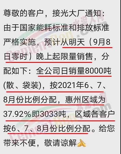 9月7日光大水泥廠通知:由于國(guó)家能耗標(biāo)準(zhǔn)和排放標(biāo)準(zhǔn)嚴(yán)格實(shí)施,預(yù)計(jì)從今日(9月8日)零時(shí)起限量銷(xiāo)售:全公司日銷(xiāo)量8000噸(散、袋裝),按2021年6、7、8月份比例分配,惠州區(qū)域?yàn)?7.92%即3033噸,區(qū)域各客戶(hù)按6、7、8月份比例分配。