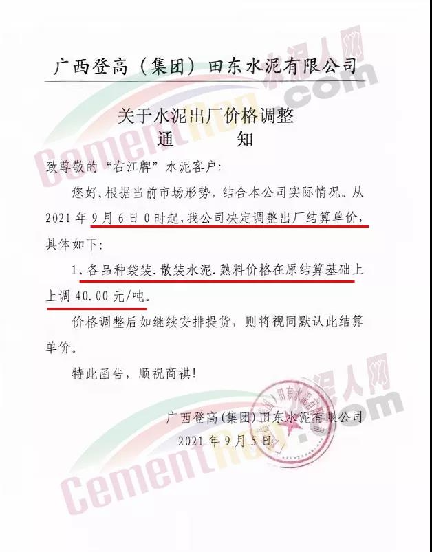 9月6日廣西登高(集團(tuán))田東水泥有限公司上調(diào)廣東區(qū)域“右江牌”散裝水泥、熟料價(jià)格50元/噸。