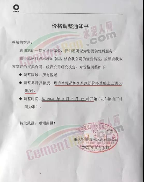 9月5日華潤(rùn)水泥對(duì)發(fā)往南寧北區(qū)域以及平南方向各品種水泥價(jià)格上調(diào)50元/噸。
