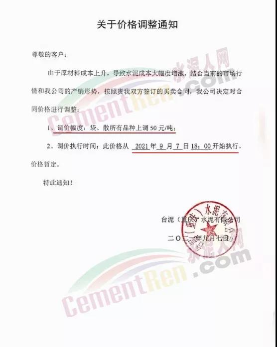 9月5日臺(tái)泥(貴港)水泥有限公司對(duì)全廣西區(qū)域的全品項(xiàng)水泥價(jià)格上調(diào)50元/噸。