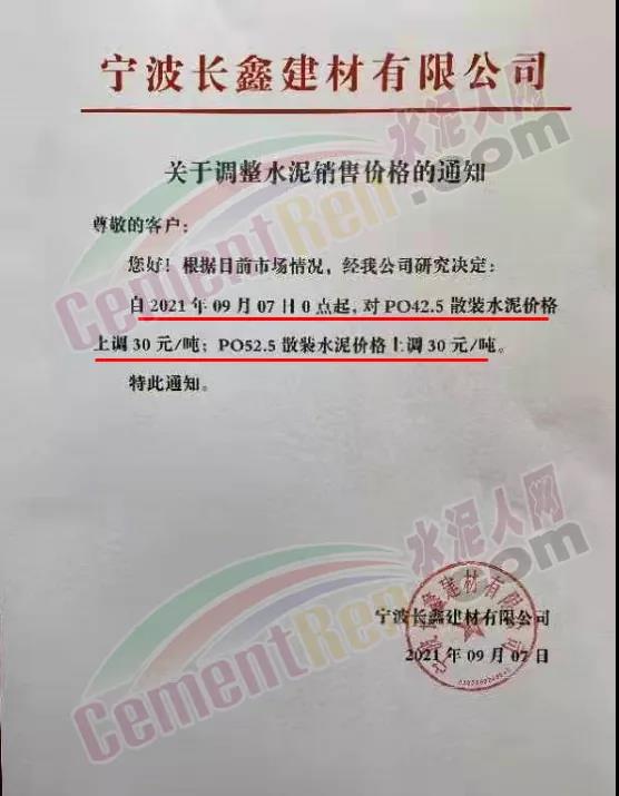 9月7日寧波長(zhǎng)鑫建材有限公司PO42.5散裝水泥價(jià)格上調(diào)30元/噸,PO52.5散裝水泥上調(diào)30元/噸。