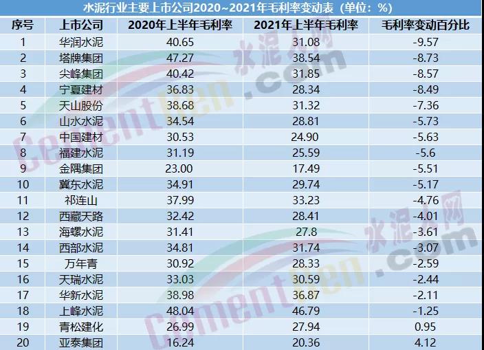 毛利率是企業(yè)在直接生產(chǎn)過程中的獲利能力的財務反映,代表了企業(yè)核心競爭力。據(jù)水泥人網(wǎng)不完全統(tǒng)計,截止至9月9日,水泥行業(yè)20家發(fā)布半年報的上市公司中,有17家出現(xiàn)了毛利率下滑的現(xiàn)象,占比約為86%,其中,華潤水泥毛利率下滑幅度最大,約為9.57%。