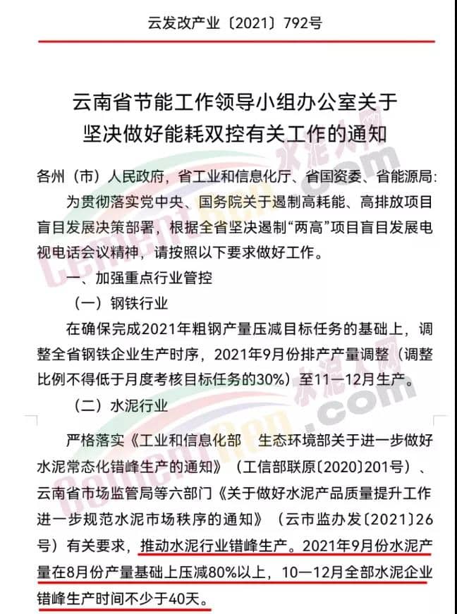 9月11日,云南省節(jié)能工作領(lǐng)導(dǎo)小組辦公室發(fā)布《關(guān)于堅決做好能耗雙控有關(guān)工作的通知》要求水泥行業(yè):2021年9月份水泥產(chǎn)量在8月份產(chǎn)量基礎(chǔ)上壓減80%以上,10—12月全部水泥企業(yè)錯峰生產(chǎn)時間不少于40天。