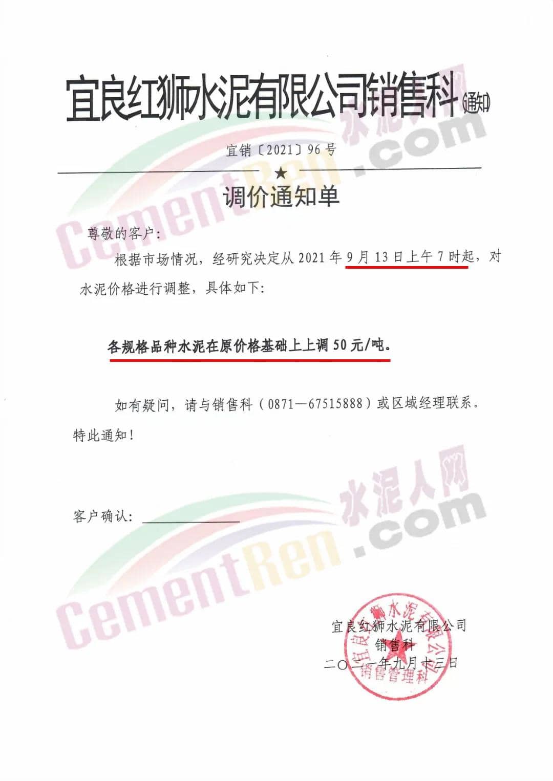 宜良紅獅水泥有限公司通知自9月13日上午7時起,上調(diào)各規(guī)格品種水泥價格50元/噸。