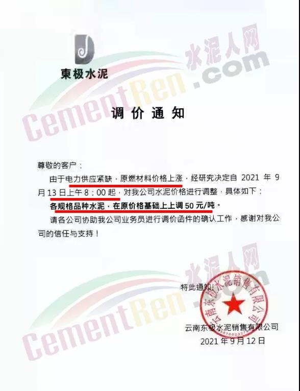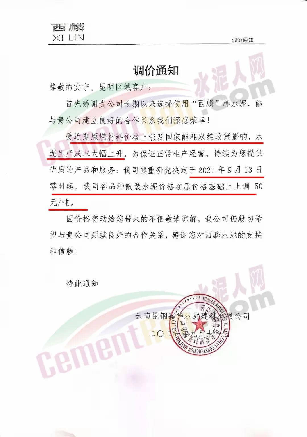 云南昆鋼嘉華水泥建材有限公司通知受近期原燃材料價格上漲及國家能耗雙控政策影響,水泥生產(chǎn)成本大幅上升,為保證正常生產(chǎn)經(jīng)營,決定于2021年9月13 日零時起,公司各品種散裝水泥價格在原價格基礎(chǔ)上上調(diào)50元/噸。