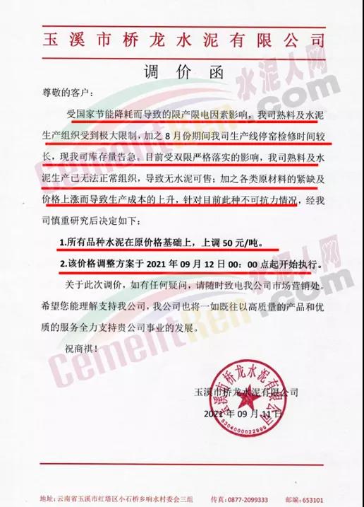 玉溪市橋龍水泥有限公司通知,受國家節(jié)能降耗而導(dǎo)致的限產(chǎn)限電因素影響,公司熟料及水泥生產(chǎn)組織受到極大限制,加之8月份期間公司生產(chǎn)線停窯檢修時間較長,現(xiàn)公司庫存量告急。目前受雙限嚴(yán)格落實的影響,公司熟料及水泥生產(chǎn)已無法正常組織,導(dǎo)致無水泥可售;加之各類原材料的緊缺及價格上漲而導(dǎo)致生產(chǎn)成本的上升,針對目前此種不可抗力情況,公司于2021年9月12日0點起開始上調(diào)所有品種水泥價格50元/噸。