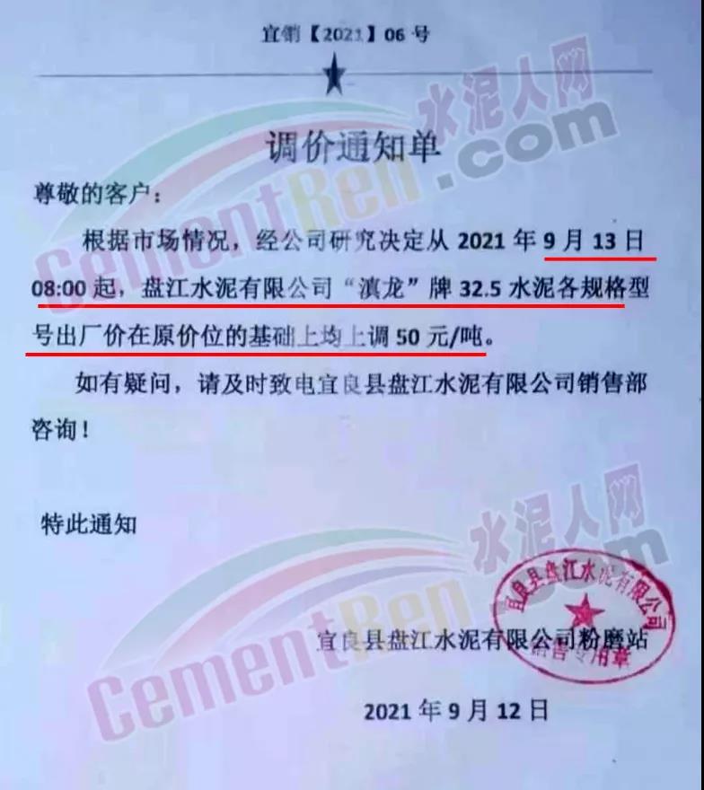 宜良縣盤江水泥有限公司粉磨站通知,自9月13日8時起,盤江水泥32.5水泥各規(guī)格出廠價上調(diào)50元/噸。
