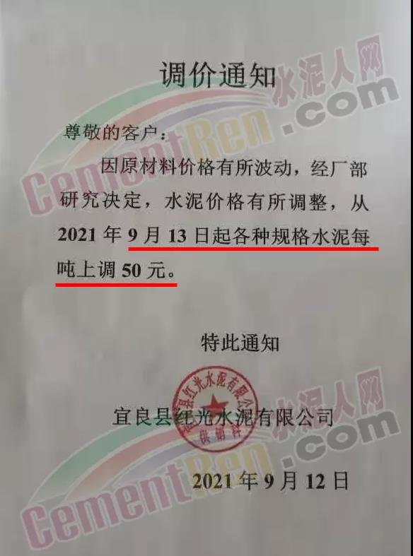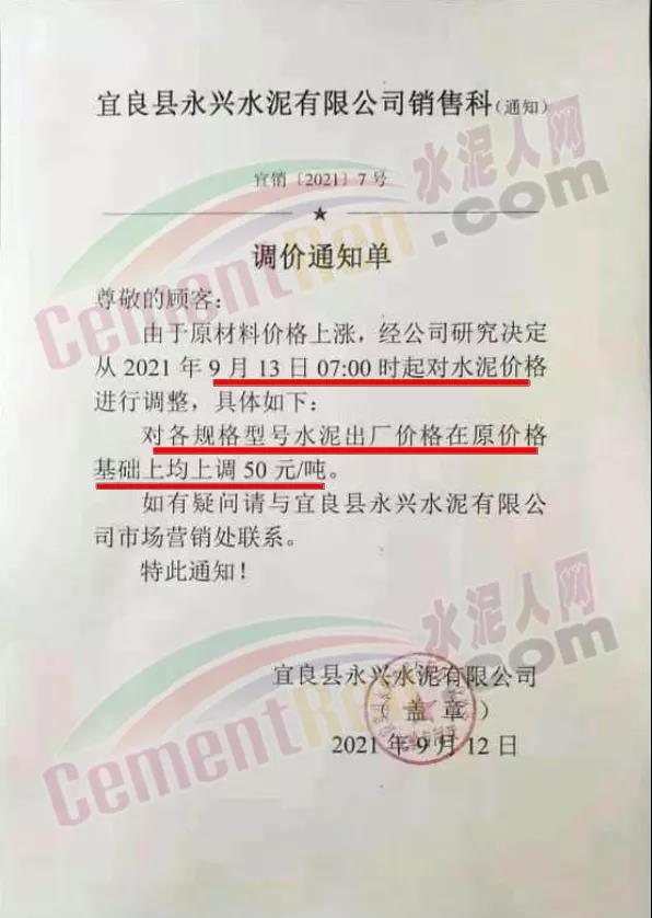 宜良縣永興水泥有限公司通知,自9月13日7時起,對各規(guī)格型號水泥出廠價上調(diào)50元/噸。