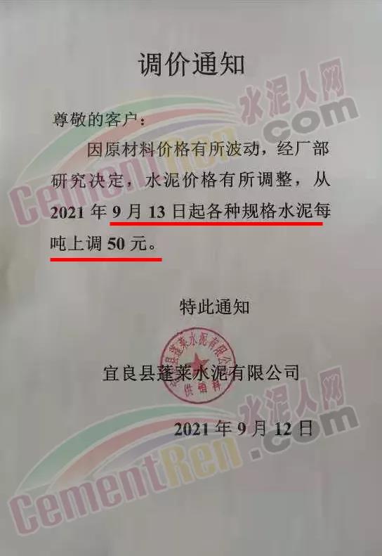 宜良縣蓬萊水泥有限公司通知9月13日各種規(guī)格水泥上調(diào)50元/噸。