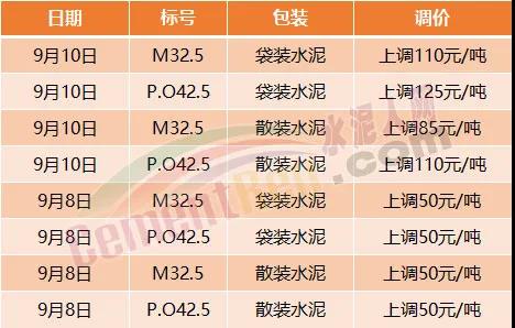 9月7日重慶綦江西南水泥、長壽西南水泥、臺泥重慶公司等9家企業(yè)通知由于原材料成本增加,所有區(qū)域所有品牌水泥價格在原執(zhí)行價格基礎(chǔ)上上調(diào)50元/噸。
