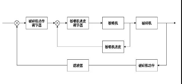 這是一個(gè)串級(jí)調(diào)節(jié)回路,主環(huán)為破碎機(jī)輸出功率調(diào)節(jié)環(huán);副環(huán)為板喂機(jī)的速度調(diào)節(jié)環(huán),實(shí)際上速度參數(shù)是作為喂料機(jī)給料率的間接參數(shù)使用的。