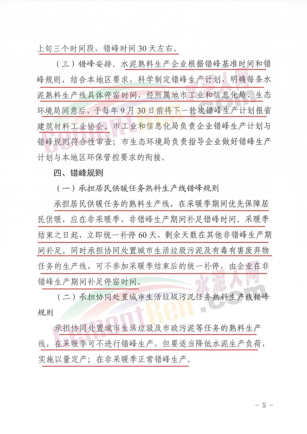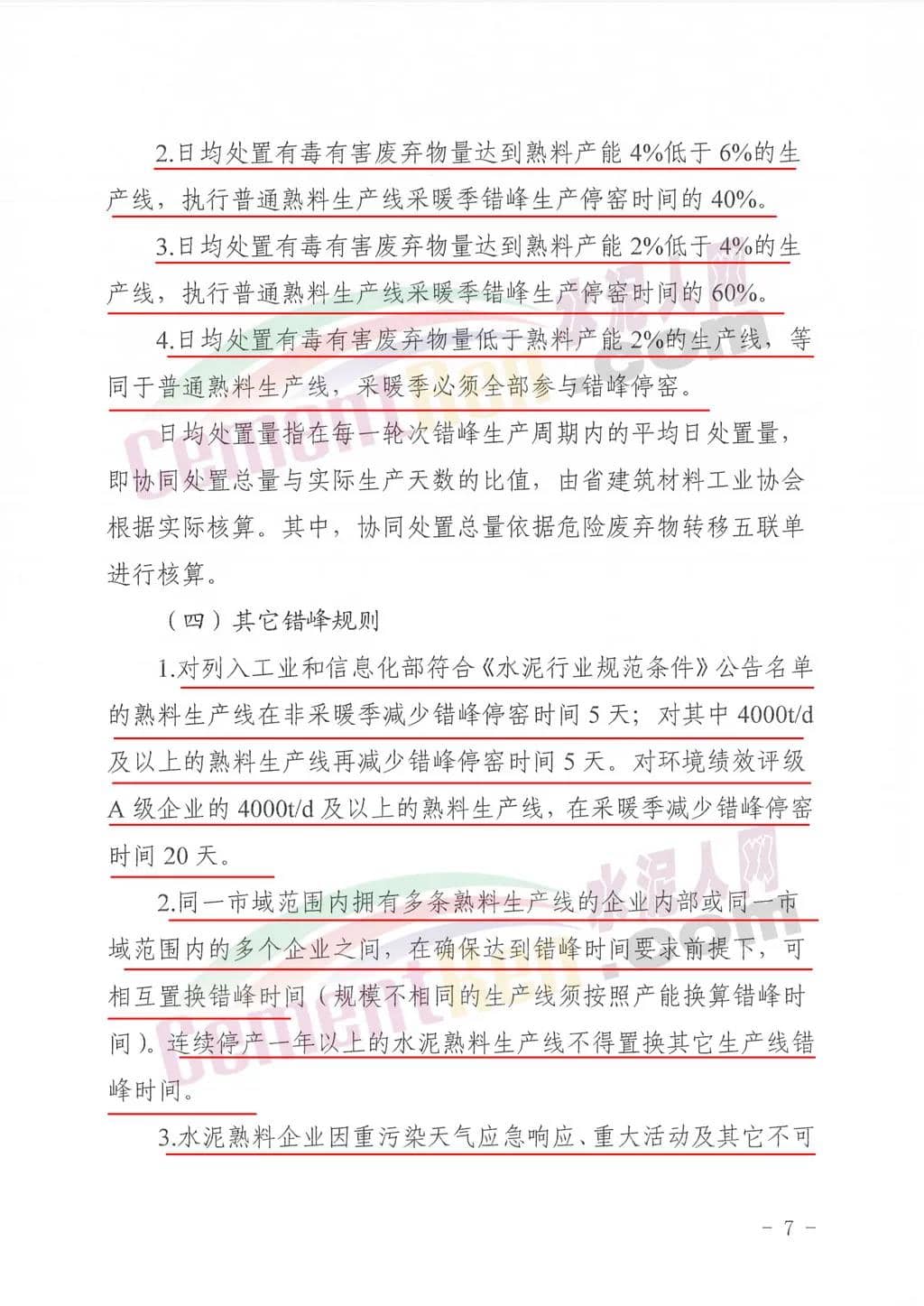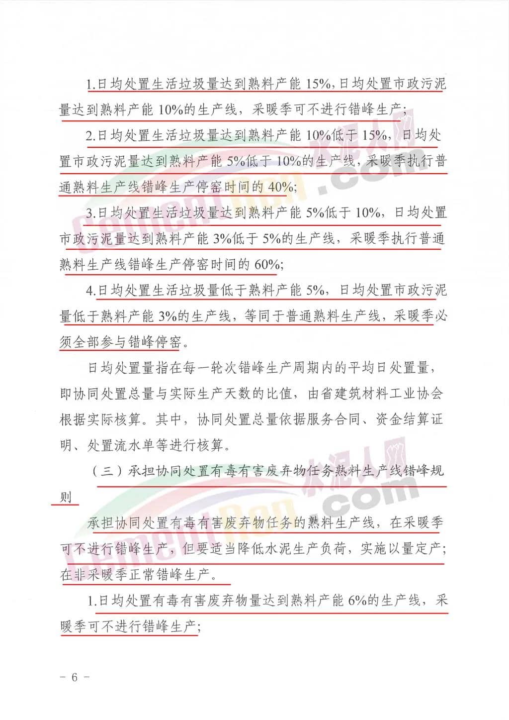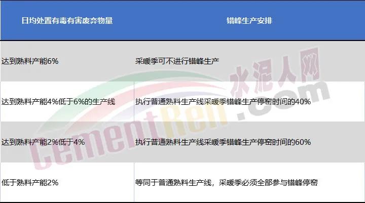承擔(dān)協(xié)同處置有毒有害廢棄物任務(wù)熟料生產(chǎn)線錯(cuò)峰規(guī)則承擔(dān)協(xié)同處置有毒有害廢棄物任務(wù)的熟料生產(chǎn)線,在采暖季可不進(jìn)行錯(cuò)峰生產(chǎn),但要適當(dāng)降低水泥生產(chǎn)負(fù)荷,實(shí)施以量定產(chǎn);在非采暖季正常錯(cuò)峰生產(chǎn)。
