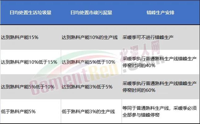 承擔(dān)協(xié)同處置城市生活垃圾及市政污泥等任務(wù)的熟料生產(chǎn)線,在采暖季可不進(jìn)行錯(cuò)峰生產(chǎn),但要適當(dāng)降低水泥生產(chǎn)負(fù)荷,實(shí)施以量定產(chǎn);在非采暖季正常錯(cuò)峰生產(chǎn)。