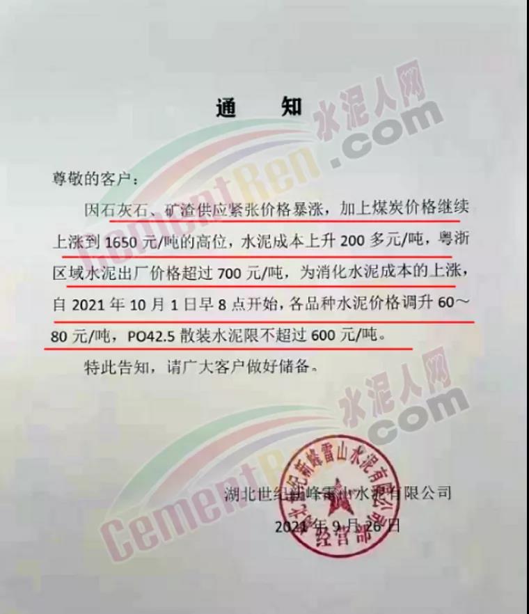 日前,湖北世紀(jì)新峰雷山水泥通知稱,因石灰石、礦渣供應(yīng)緊張價(jià)格暴漲,加上煤炭?jī)r(jià)格繼續(xù)上漲到1650元/噸的高位,水泥成本上升200多元/噸,粵浙區(qū)域水泥出廠價(jià)格超過(guò)700元/噸。為消化水泥成本的上漲,自2021年10月1日早8點(diǎn)開始,各品種水泥價(jià)格調(diào)升60~80元/噸,PO42.5散裝水泥限不超過(guò)600元/噸。