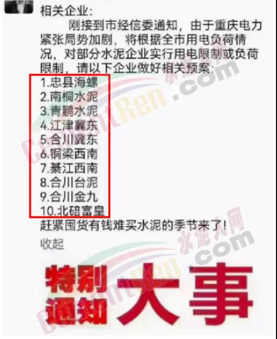 最近一則通知消息,在重慶地區(qū)水泥行業(yè)里熱傳,水泥銷售紛紛提示客戶趕緊囤貨有錢難買水泥的季節(jié)來(lái)了。消息稱:剛接到市經(jīng)信委通知,由于重慶電力緊張局勢(shì)加劇,將根據(jù)全市用電負(fù)荷情況,對(duì)部分水泥企業(yè)實(shí)行用電限制或負(fù)荷限制,涉及忠縣海螺、南桐水泥、青鵬水泥、江津冀東、合川冀東、銅梁西南、綦江西南、合川臺(tái)泥、合川金九、北碎富皇10家水泥企業(yè)。