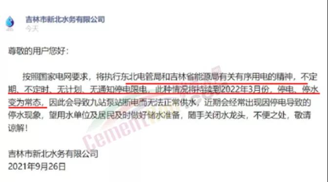 吉林市新北水務(wù)有限公司2021年9月26日發(fā)布公告稱,按照國(guó)家電網(wǎng)要求,將執(zhí)行東北電管局和吉林省能源局有關(guān)有序用電的精神,不定期、不定時(shí)、無(wú)計(jì)劃、無(wú)通知停電限電,此種情況將持續(xù)到2022年3月份,停電、停水變?yōu)槌B(tài),因此會(huì)導(dǎo)致九站泵站斷電而無(wú)法正常供水,近期會(huì)經(jīng)常出現(xiàn)因停電導(dǎo)致的停水現(xiàn)象,望用水單位及居民及時(shí)做好儲(chǔ)水準(zhǔn)備,隨手關(guān)閉水龍頭,不便之處,敬請(qǐng)諒解!