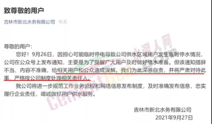據(jù)了解目前該公司已經(jīng)刪除上述通知。并于9月27日,吉林市新北水務(wù)有限公司在其微信公眾號(hào)發(fā)布公告:9月26日,因擔(dān)心可能臨時(shí)停電導(dǎo)致公司供水區(qū)域用戶發(fā)生臨時(shí)停水情況稱,公司在公眾號(hào)上發(fā)布通知,主要是為了提醒廣大用戶及時(shí)做好儲(chǔ)水準(zhǔn)備。但該通知措辭不當(dāng)、內(nèi)容不準(zhǔn)確,給相關(guān)用戶和公眾造成誤解。我們?yōu)榇松罡凶载?zé),并將嚴(yán)肅對(duì)待此事,嚴(yán)格按公司制度處理相關(guān)責(zé)任人。公司將進(jìn)一步規(guī)范工作業(yè)務(wù)流程和網(wǎng)絡(luò)信息發(fā)布制度,及時(shí)準(zhǔn)確發(fā)布信息,忠實(shí)履行企業(yè)責(zé)任,竭誠(chéng)做好用戶供水服務(wù)。