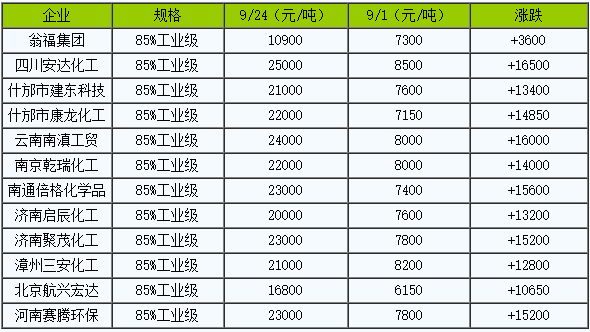 部分企業(yè)磷酸9月1日~24日價(jià)格漲跌情況表