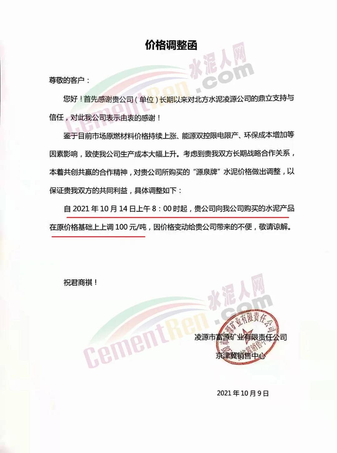 同日,北京金隅經(jīng)貿(mào)公司通知,由于煤炭等原燃材料價(jià)格持續(xù)大幅上漲以及環(huán)保管控升級(jí)、限電等因素影響,致使公司水泥生產(chǎn)成本不斷提高。為保證企業(yè)的正常運(yùn)營自2021年10月11日8時(shí)起,公司各品種水泥出廠價(jià)在原價(jià)格基礎(chǔ)上上調(diào) 100元/噸。