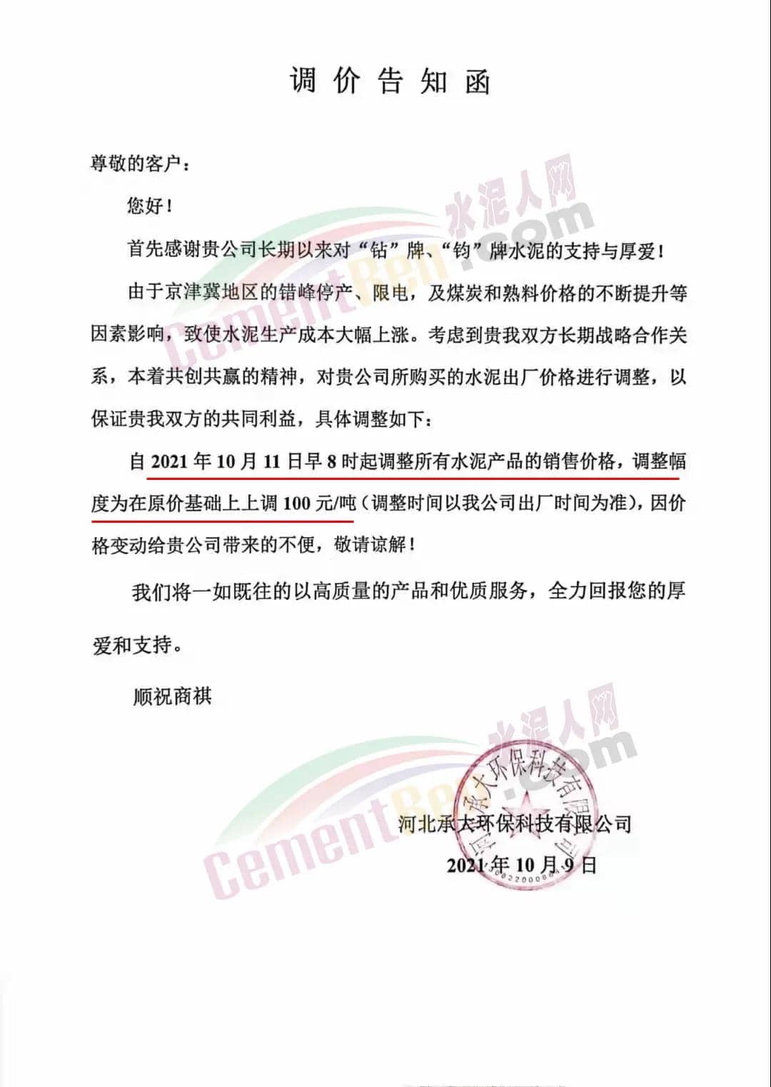 河北承大環(huán)??萍加邢薰就ㄖ捎诰┙蚣降貐^(qū)的錯(cuò)峰停產(chǎn)、限電,及煤炭和熟料價(jià)格的不斷提升等因素影響,致使水泥生產(chǎn)成本大幅上漲,自2021年10月11日早8時(shí)起所有水泥產(chǎn)品銷售價(jià)格在原價(jià)基礎(chǔ)上上調(diào)100元/噸。