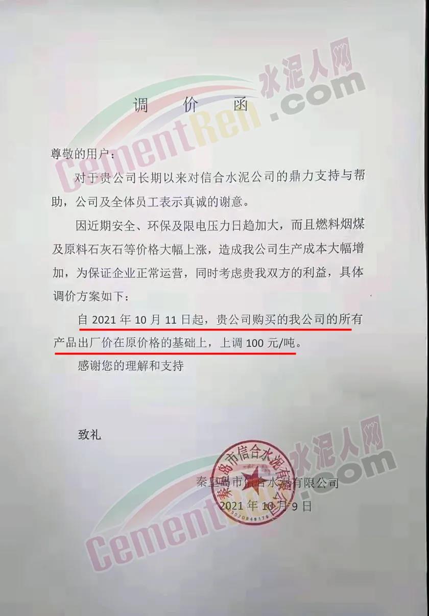 秦皇島信合水泥有限公司通知,因近期安全、環(huán)保及限電壓力日趨加大,而且燃料煙煤及原料石灰石等價(jià)格大幅上漲,造成公司生產(chǎn)成本大幅增加,為保證企業(yè)正常運(yùn)營,自2021年10月11日起,公司的所有產(chǎn)品出廠價(jià)在原價(jià)格的基礎(chǔ)上,上調(diào)100元/噸。
