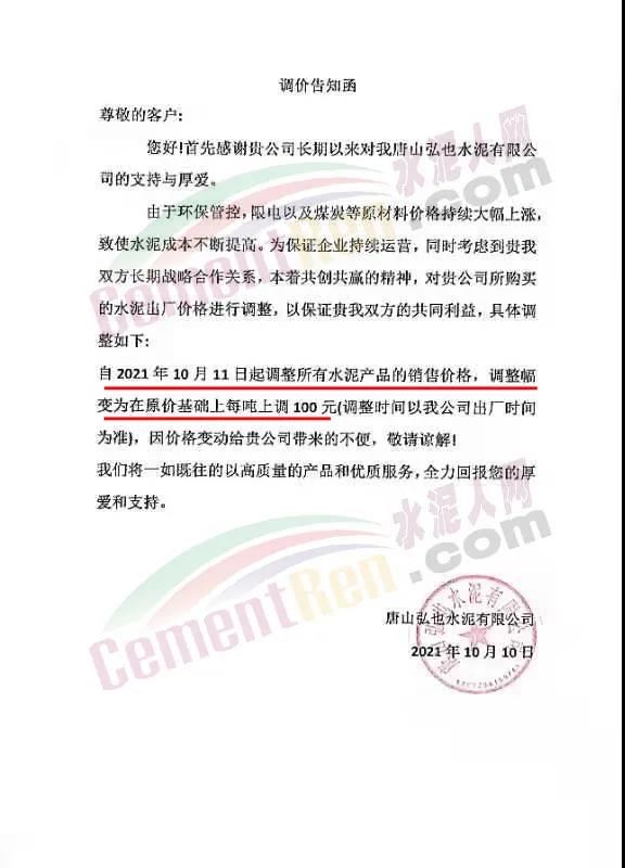 唐山弘也水泥有限公司通知,由于環(huán)保管控,限電以及煤炭等原材料價(jià)格持續(xù)大幅上漲,致使水泥成本不斷提高。為保證企業(yè)持續(xù)運(yùn)營,自2021年10月11日起調(diào)整所有水泥產(chǎn)品的銷售價(jià)格在原價(jià)基礎(chǔ)上上調(diào)100元/噸。