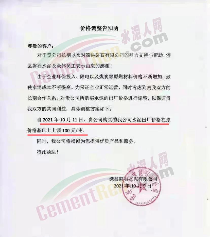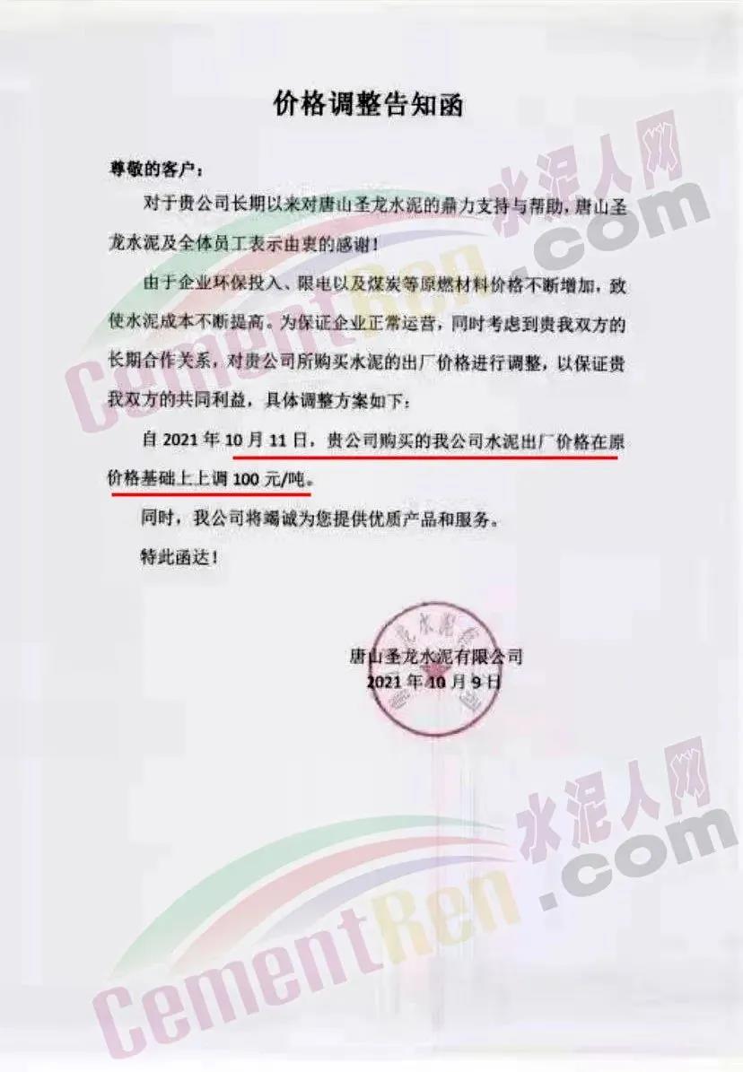唐山圣龍水泥有限公司通知由于企業(yè)環(huán)保投入、限電以及煤炭等原燃材料價(jià)格不斷增加,致使水泥成本不斷提高。為保證企業(yè)正常運(yùn)營,自2021年10月11日,公司水泥出廠價(jià)格在原價(jià)格基礎(chǔ)上上調(diào)100元/噸。