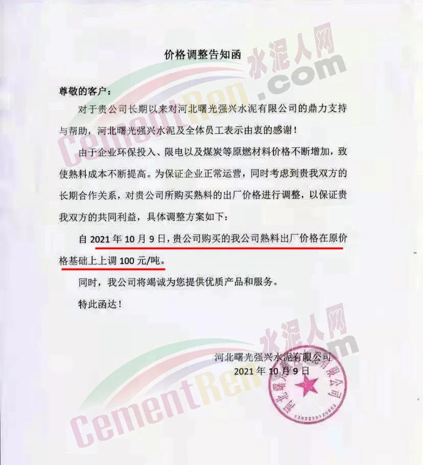 河北曙光強(qiáng)興水泥有限公司通知,由于企業(yè)環(huán)保投入、限電以及煤炭等原燃材料價(jià)格不斷增加,致使熟料成本不斷提高。為保證企業(yè)正常運(yùn)營,自2021年10月9日,公司熟料出廠價(jià)格在原價(jià)格基礎(chǔ)上上調(diào)100元/噸。
