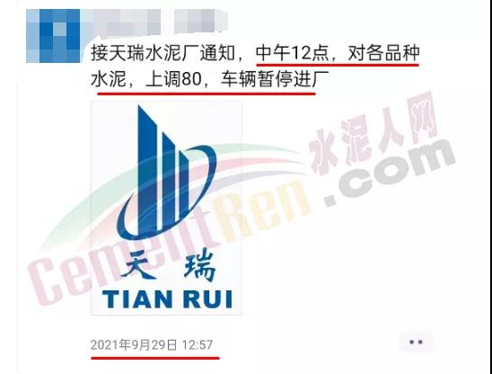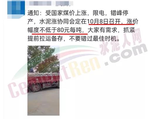 同日有經(jīng)銷商通知,受國家煤價上漲,限電,錯峰停產(chǎn),水泥漲協(xié)同會定在10月8日召開,漲價幅度不低于80元/噸,大家有需求,抓緊提前拉運(yùn)備存,不要錯過最佳時機(jī)。
