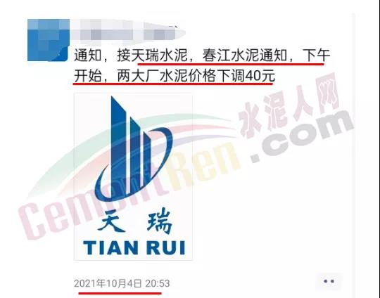 10月4日天瑞水泥、春江水泥等通知下調(diào)水泥價格40元/噸。