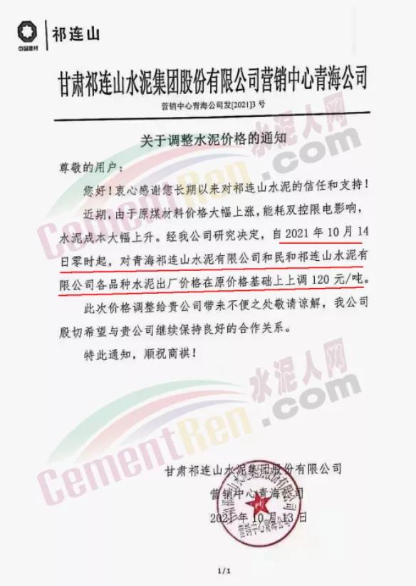 ?日前青海區(qū)域主要品牌企業(yè)通知,上調(diào)水泥價格50-120元/噸。其中,甘肅祁連山水泥集團股份有限公司通知,由于原煤材料價格大幅上漲,能耗雙控限電影響,水泥成本大幅上升。經(jīng)公司研究決定,自2021年10月14日零時起,對青海祁連山水泥有限公司和民和祁連山水泥有限公司各品種水泥出廠價格在原價格基礎上上調(diào)120元/噸。