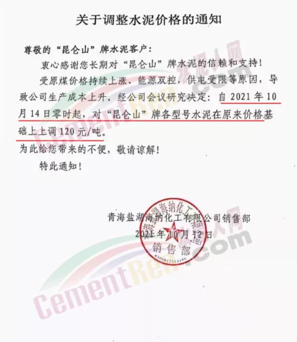 青海鹽湖海納化工有限公司銷售部通知,受原煤價格持續(xù)上漲、能源雙控,供電受限等原因,導致公司生產(chǎn)成本上升。經(jīng)公司會議研究決定∶自2021年10月14日零時起,對“昆侖山”牌各型號水泥在原來價格基礎上上調(diào)120元/噸。