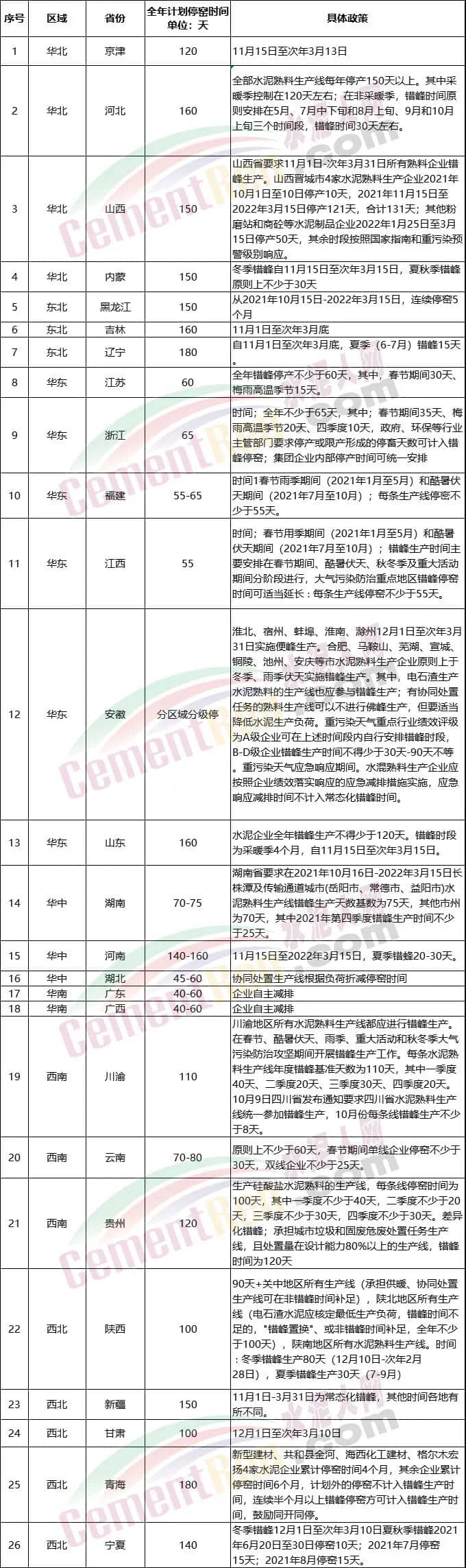據(jù)水泥人網(wǎng)不完全統(tǒng)計,26個省市自治區(qū)常態(tài)化錯峰生產(chǎn)最長停產(chǎn)6個月(180天)其中采暖季錯峰生產(chǎn)最長150天為當年11月1日至次年3月底。