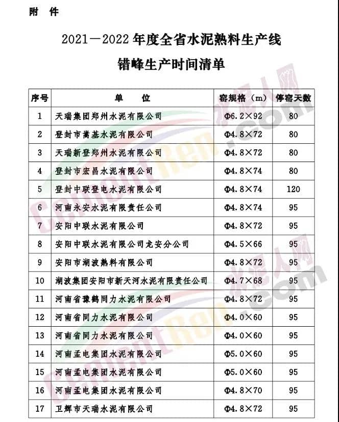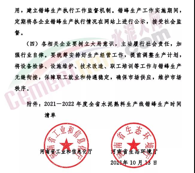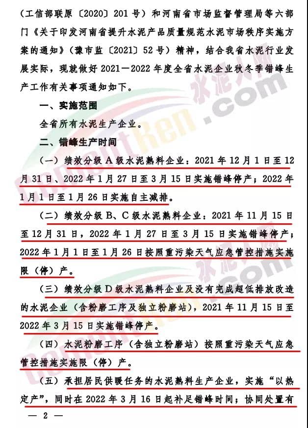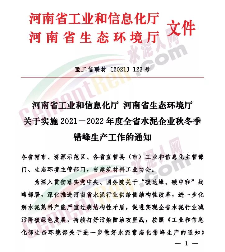 水泥人網(wǎng)通訊員消息,日前,河南河南省工業(yè)和信息化廳聯(lián)合河南省生態(tài)環(huán)境廳發(fā)布《關于實施2021-2022年度全省水泥企業(yè)秋冬季錯峰生產(chǎn)工作的通知》要求,全省所有水泥生產(chǎn)企業(yè)2021年11月15日至2022年3月15日期間實施差異化錯峰停產(chǎn)。