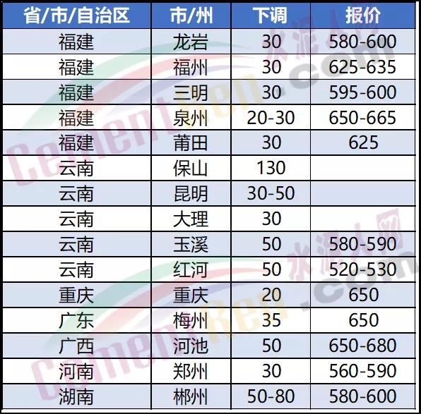 水泥人網(wǎng)通訊員消息,近期福建、云南、湖南省內(nèi)多區(qū)域水泥價(jià)格下跌30-80元/噸。