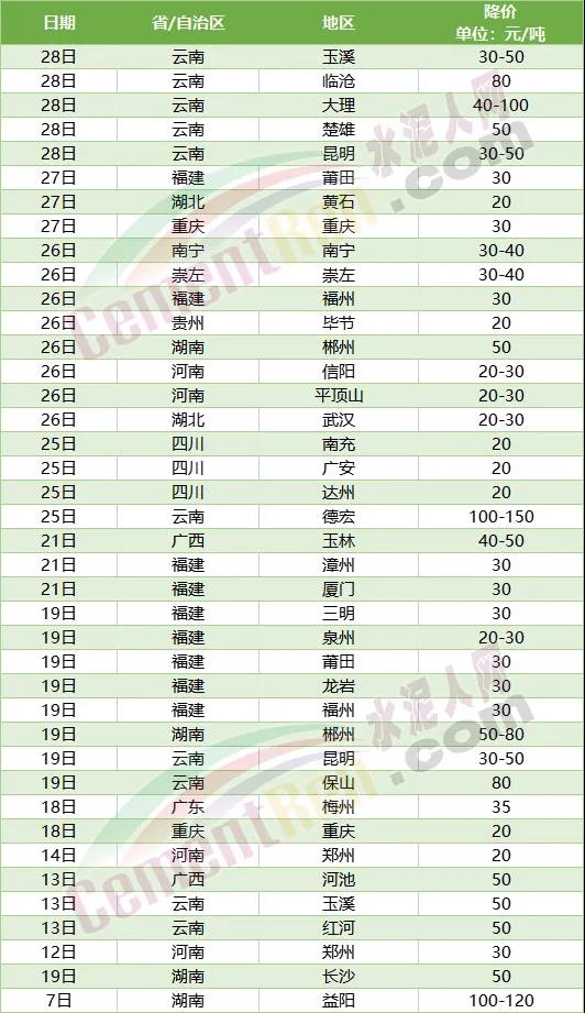 水泥人網(wǎng)信息中心相關(guān)數(shù)據(jù)顯示,本月內(nèi)福建三明、泉州、莆田、龍巖、福州、漳州、廈門;廣東梅州、廣西河池、貴州畢節(jié)、河南鄭州、湖北黃石、湖南益陽(yáng)、長(zhǎng)沙、郴州;四川南充、廣安、達(dá)州;云南玉溪、紅河、昆明、大理、保山、德宏以及重慶地區(qū)水泥價(jià)格均有不同幅度的下跌。