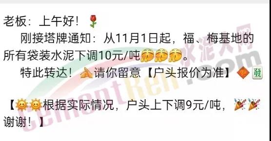 塔牌水泥經(jīng)銷商發(fā)通知稱,接塔牌通知,從11月1日起福、梅基地的所有袋裝水泥下調(diào)10元/噸。