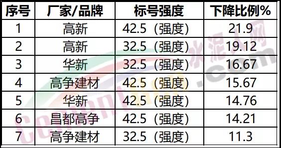 普通硅酸鹽水泥出廠價格與去年同比,重點監(jiān)測的8個品種價格“7降1升”,下降的分別為: