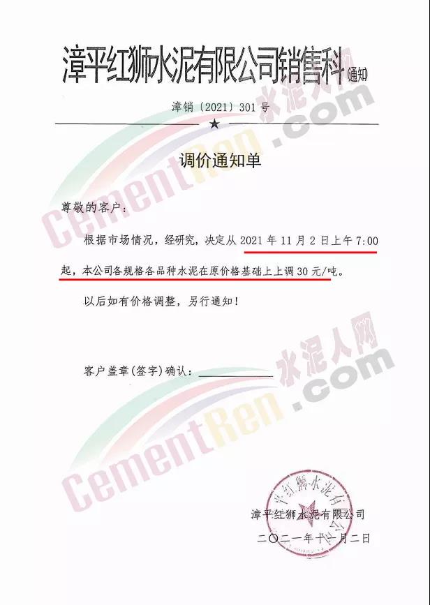 漳平紅獅水泥有限公司銷售科通知自11月2日上午7時(shí)起各規(guī)格各品種水泥在原價(jià)基礎(chǔ)上上調(diào)30元/噸。