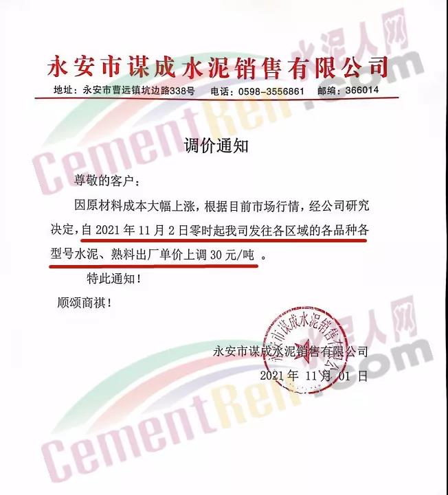 日前,永安市謀成水泥銷售公司通知,因原材料成本大幅上漲,根據(jù)目前市場行情 ,經(jīng)公司研究決定,自11月2日零時(shí)起公司發(fā)往各區(qū)域的各品種各型號水泥、熟料出廠單價(jià)上調(diào)30元/噸。