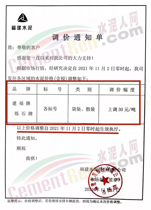 福建水泥股份有限公司通知,根據(jù)市場行情 ,經(jīng)研究決定自11月2日零時(shí)起公司發(fā)往各區(qū)域的水泥價(jià)格上調(diào)30元/噸。