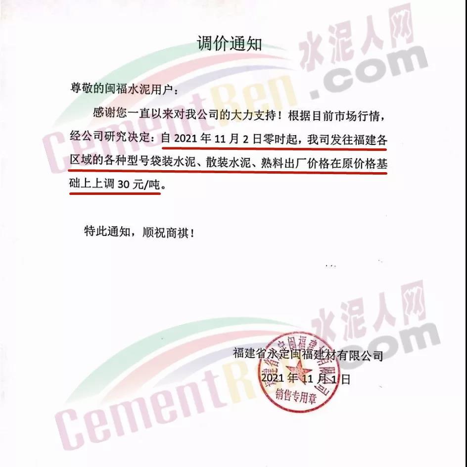 福建省永定閩福建材有限公司通知,根據(jù)目前市場行情,經(jīng)公司研究決定,自11月2日零時(shí)起,公司發(fā)往福建各區(qū)域的各型號袋裝水泥、散裝水泥、熟料出廠價(jià)格在原價(jià)基礎(chǔ)上上調(diào)30元/噸。但據(jù)經(jīng)銷商反映,漲價(jià)落實(shí)情況非常不樂觀,“漲價(jià)函”變成“止跌函”。