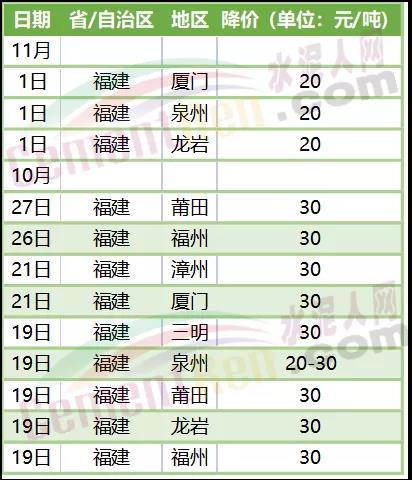 進(jìn)入11月,廣東、河北、福建、湖南、云南、遼寧、四川、河南等多區(qū)域主要品牌企業(yè)已率先通知下調(diào)水泥水泥價(jià)格。