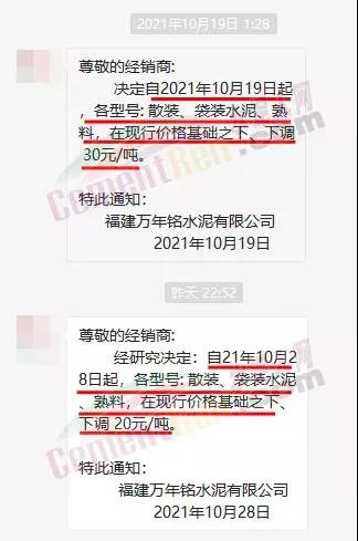 福建萬年銘水泥有限公司繼19日發(fā)通知下調(diào)各標(biāo)號水泥及熟料價(jià)格30元/噸后,于28日再次通知各型號散裝、袋裝、熟料在現(xiàn)行價(jià)格基礎(chǔ)上下調(diào)20元/噸,10天內(nèi)累計(jì)下調(diào)50元/噸。又于11月2日企業(yè)通知區(qū)域內(nèi)普漲30元/噸。